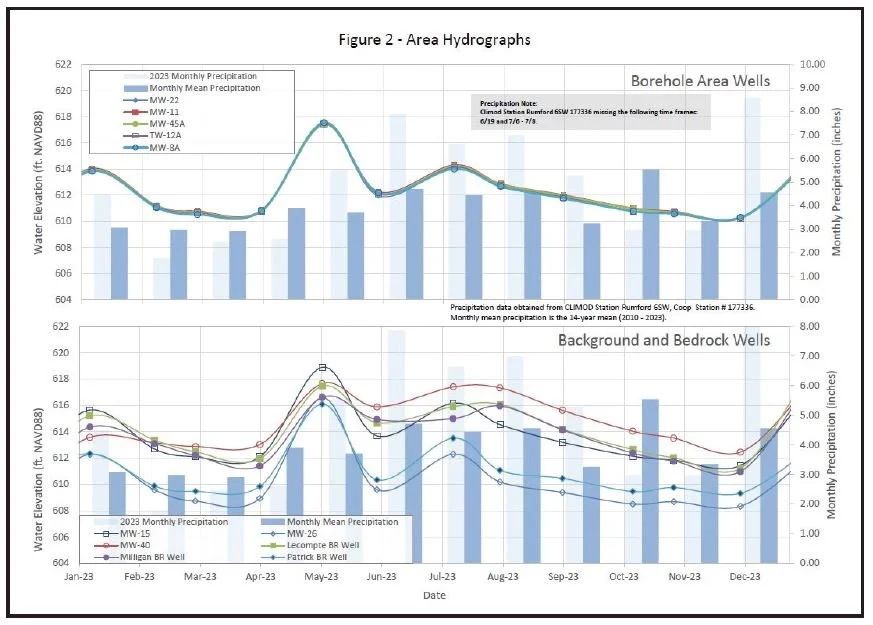 As depicted in the bottom graph of Figure 2, groundwater levels in background (off-site) monitoring wells located in the Ellis River valley, but outside of the immediate spring water borehole area also exhibit normal seasonal variation similar to water levels measured in close proximity to the Ellis Spring boreholes. Inspection of the graphs indicate that seasonal conditions and changes in precipitation correlate with trends of groundwater levels measured both on and off-site.