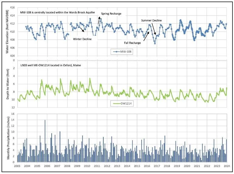 The graph in Figure 2 summarizes important measures of the health of the natural groundwater system. The graph depicts water levels typically observed in the Wards Brook Aquifer. MW-108 is an overburden (sand and gravel) monitoring well centrally located within the Wards Brook Aquifer. For comparison, water levels from U.S. Geological Survey (USGS) well ME-OW1214 are also presented. This well is located in Oxford, Maine and is also an overburden monitoring well.