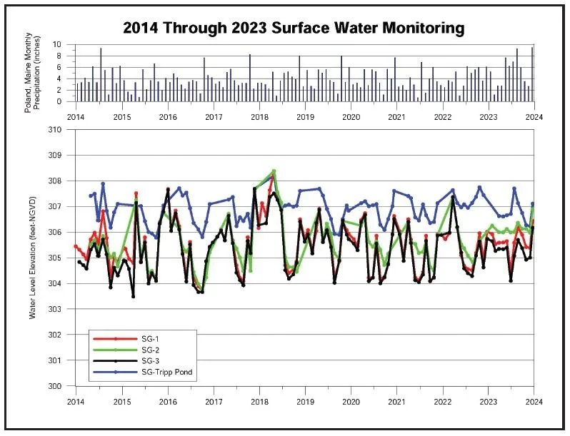 The graphs below summarize important measures of the health of the natural groundwater and surface water systems. The first graph (Figure 2) depicts groundwater levels over the past ten years of monitoring at six monitoring wells at the Garden Spring site and one monitoring well at the abutting Mechanic Falls Water District site. The groundwater levels in the Garden Spring Aquifer naturally fluctuate by a few feet, depending on the season and the amount of precipitation. Spring and fall rains typically lead to aquifer recharge, while growth and uptake of water by plants in the summer decrease aquifer water levels, as does the lack of recharge during winter months when the ground is frozen. Inspection of the graphs indicate that fluctuations of precipitation each year correlates with trends of groundwater levels measured at on-site monitoring wells. Historically, the monitoring data show that BlueTriton’s activities have not resulted in adverse impacts on these natural cycles.